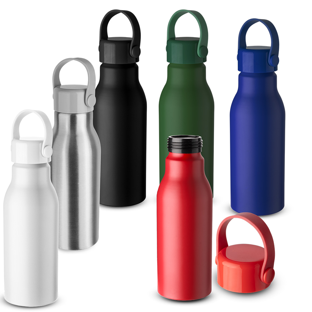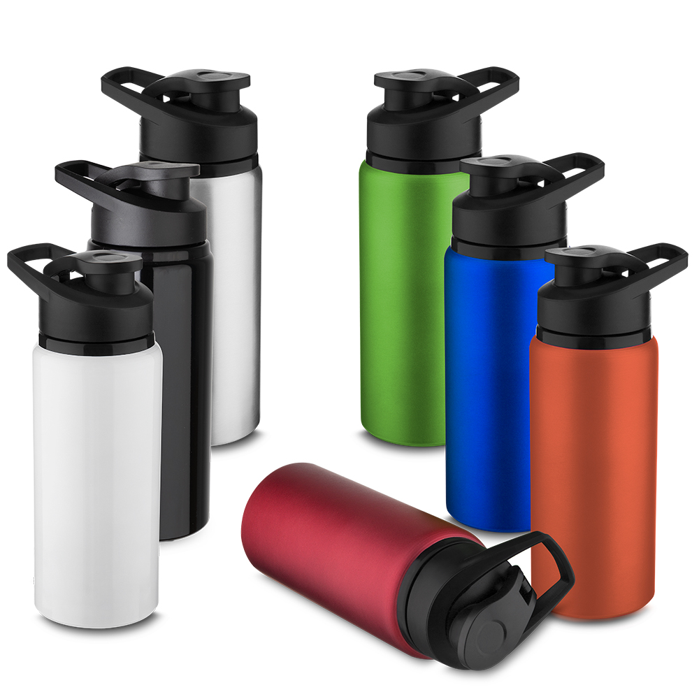 Garrafa de alumínio com capacidade de até 650ml em cores. Tampa rosqueável, bico com tampa vedada de acesso rápido, e alça para transporte. Nas cores preta, branca e prata, possui corpo com acabamento brilhante — com exceção das versões coloridas, que apresentam acabamento fosco.