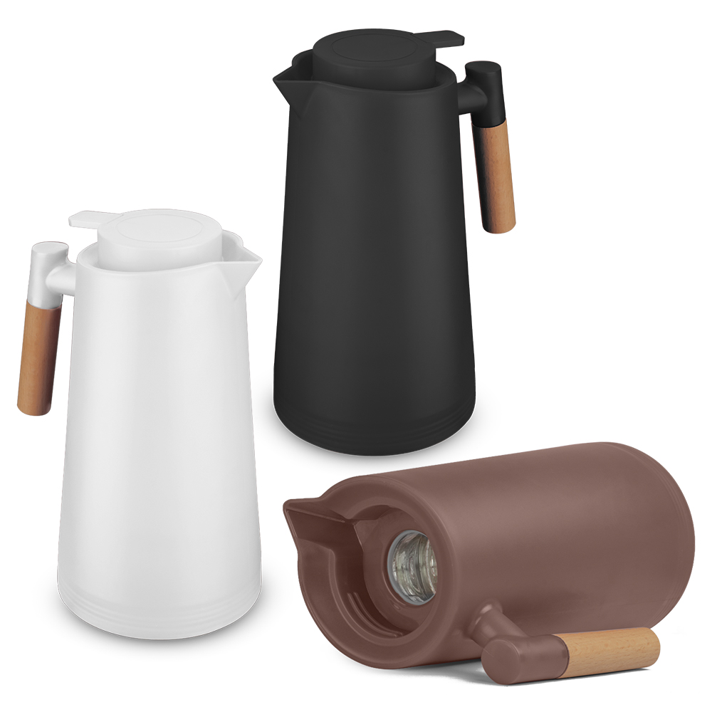 Garrafa térmica capacidade 1 Litro em plástico PP, ampola de vidro interna removível para higienização, alça lateral em madeira, tampa rosqueável em plástico com anel de silicone para vedação com sistema corta-pingo.