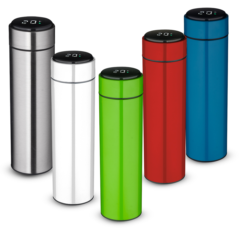 Garrafa térmica em aço inox com parede dupla isolada a vácuo, com capacidade até 450ml. Tampa rosqueável com anel de silicone para vedação. Possui infusor para chás. Display LED com termômetro digital na tampa para indicar a temperatura do líquido. Possui tampa removível para a troca da bateria. Acompanha bateria extra.