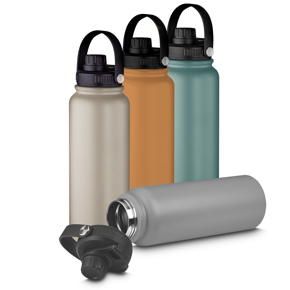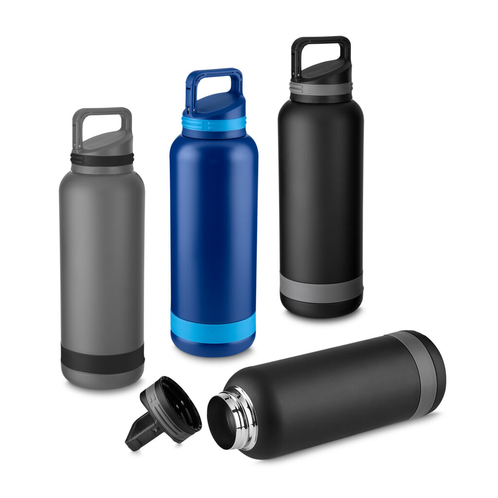 Garrafa térmica em aço inox com parede dupla isolada a vácuo, com capacidade de 850ml e conta com uma pintura a pó. Tampa rosqueável com e anel de silicone para vedação. Alça de transporte em plástico. Permite-se hidratar por canudo ou bico.