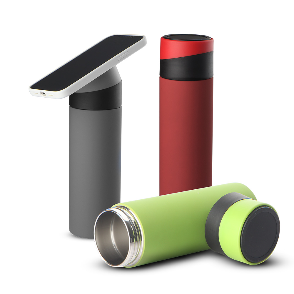 Garrafa térmica em aço inox com parede dupla isolada a vácuo, com capacidade de até 400 ml. Tampa rosqueável com anel de silicone para vedação. Com apoio de silicone para o celular na tampa.