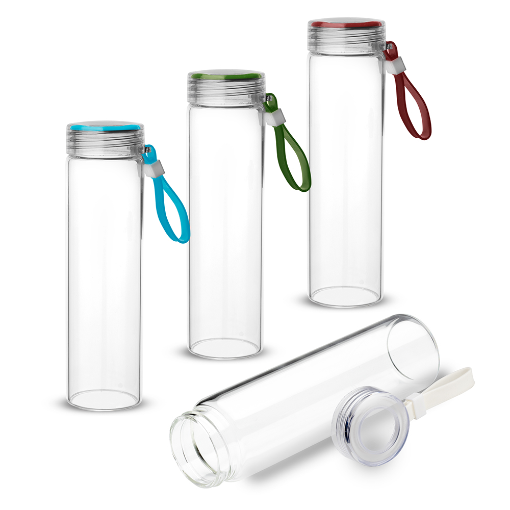 Garrafa em vidro borossilicato com capacidade de 400ml. Alça de transporte em silicone. Tampa de plástico rosqueável com anel de silicone.