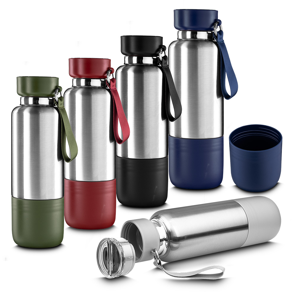 Garrafa térmica em aço inox com parede dupla Isolada a vácuo com capacidade de até 500 ml. Tampa plástica rosqueável, alça em silicone e anel de silicone para vedação. Pintura a pó.