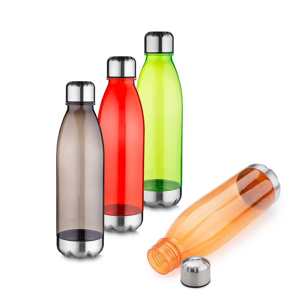 Garrafa plástica em RPET com capacidade de até 700 ml com alça flexível em silicone. Tampa rosqueável com anel de silicone para vedação, base em metal.